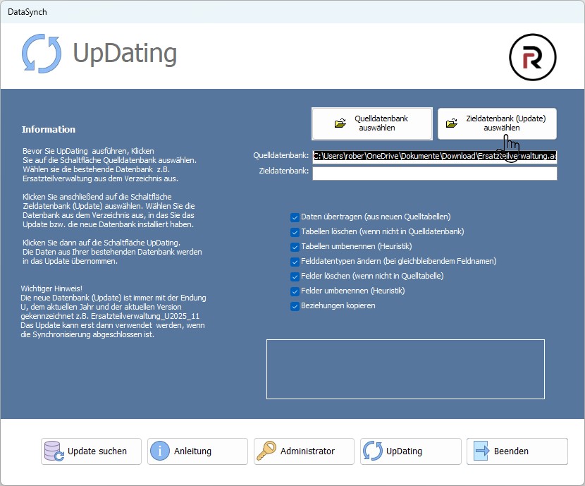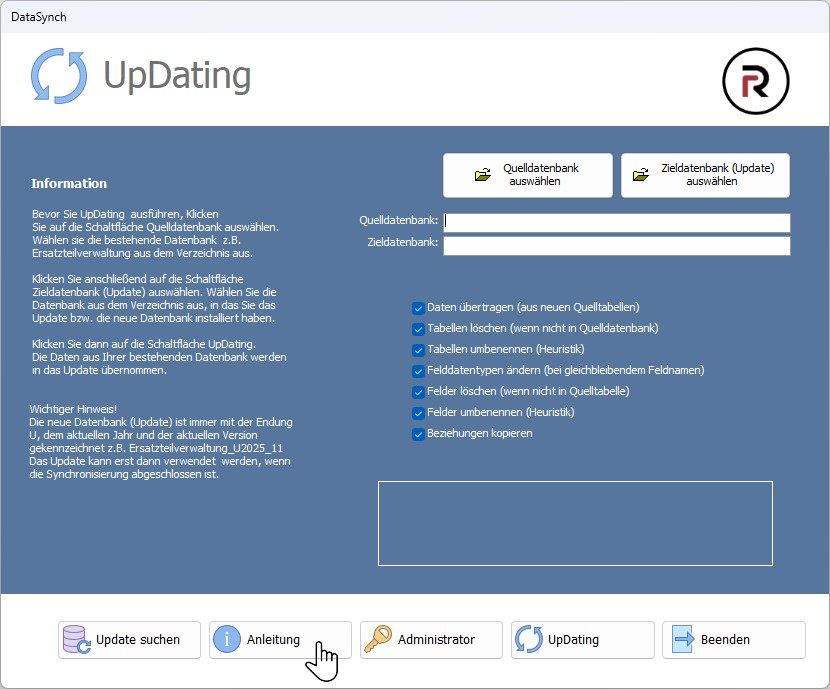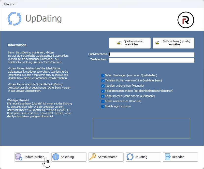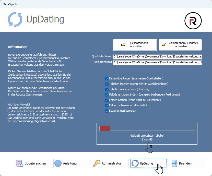Mit dem Tool "UpDating" können Sie Ihre Datenbanken bequem und effizient aktualisieren. Es bietet eine benutzerfreundliche Oberfläche und leistungsstarke Funktionen, um sicherzustellen, dass Ihre Daten immer auf dem neuesten Stand sind.