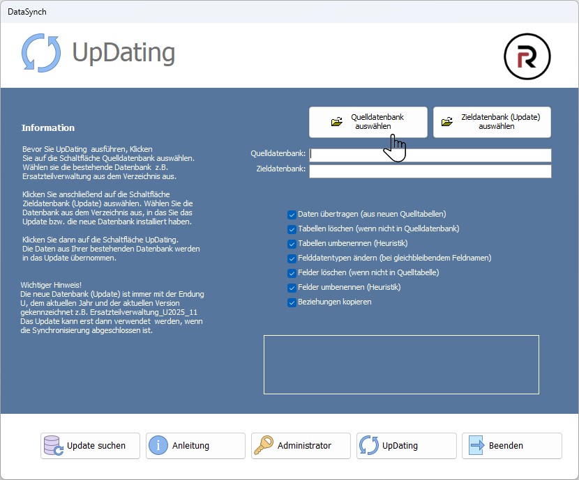 Mit dem Tool "UpDating" können Sie Ihre Datenbanken bequem und effizient aktualisieren. Es bietet eine benutzerfreundliche Oberfläche und leistungsstarke Funktionen, um sicherzustellen, dass Ihre Daten immer auf dem neuesten Stand sind.